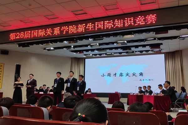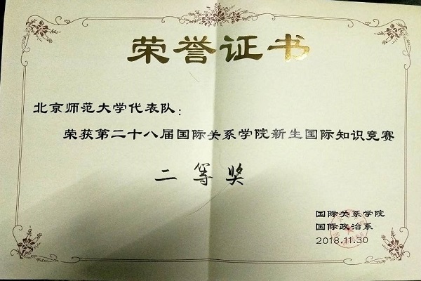 2018年11月30日晚,2018年首都高校新生国际知识竞赛在国际关系学院学术交流中心成功举办,由我校外国语言文学学院邵楠、励耘学院梁炜晗、历史学院陈楠峰组成的北京师范大学代表队应邀参加比赛,最终荣获亚军。我院“形势与政策”小组组长秦雅婕,副组长兼组织专员陈力文,组长助理孟京城、黄薇谕,学研顾问赵文博,原副组长宁轩,原组长助理卢冰屿等前往现场观摩了比赛。
