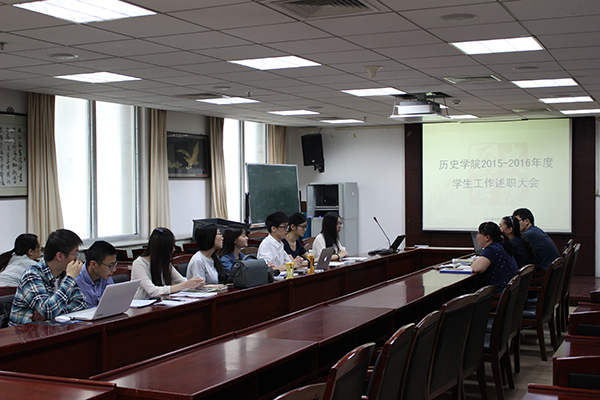 分团委副书记王聪从分团委组织内部建设、日常工作开展和常规活动开展等三个方面介绍了分团委一年以来迎接新生、组织社团招新、 举办“陈垣杯”大学生历史知识竞赛、组建基层团小组和举办主题团日等活动。学生会主席鲍天璐介绍了第三十六届学生会的组织制度创新、常规活动开展、团建等工作的创新点,并反思了工作中的不足,对学生会工作提出了计划与展望。研究生会主席蔡妍妍回顾了研究生会一年以来的工作,并对未来作了展望。春秋学社社长宣柳在述职报告中从“强基固本,完善内部建设”“与时俱进,纪念抗战胜利”“服务社会,弘扬传统文化”和“知行合一,营造学术氛围”等方面对春秋学社一年的活动情况做了回顾。春秋人文报社长陈雅芬介绍了报社的组织结构,在制度创新方面介绍了工作“指令单制度”,着重说明了第二届家史征文大赛等品牌活动的相关情况,还介绍了制作社团徽章等社团建设工作。“形势与政策”小组组长张俊毅就组织内部建设、日常工作开展、学生活动开展、工作的亮点与成就以及工作中的遗憾及改进工作等几个方面介绍了“形势与政策”小组一年以来的众多精彩活动。 分党委副书记王卓凯老师最后作了总结,她代表历史学院分党委对各个社团的工作给予肯定并提出建议,对各社团负责人表达了感谢,并要求各负责人对社团“时时关心,传授经验”。