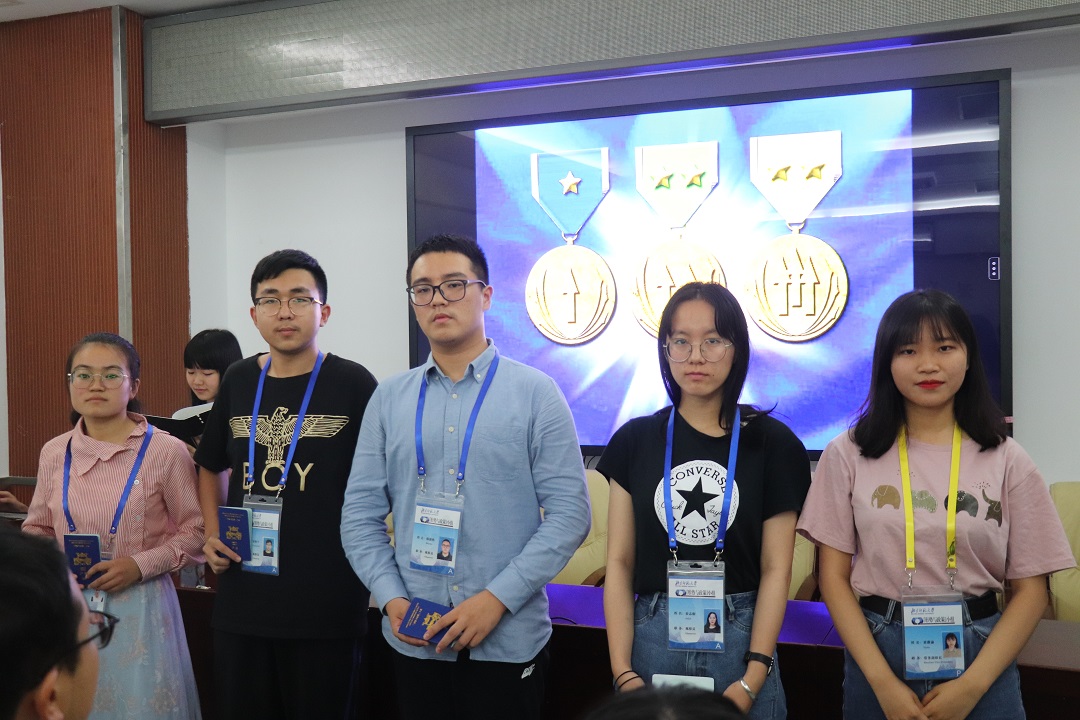 第十三届小组组长胡潇予、常务副组长黄薇瑜、秘书长贾晰涵、副组长兼外联专员徐源辰分别为新生授发胸牌和护照。护照内页包含北师大校徽、小组的标徽等设计元素,签证页的底纹为北师大各处标志性建筑。小组护照是小组成员身份的象征,也将是小组成员成长蜕变的见证。另外,2019级硕士研究生闫波桥也加入了小组,小组第六、七届组长宋文经为他授予了胸牌和护照。