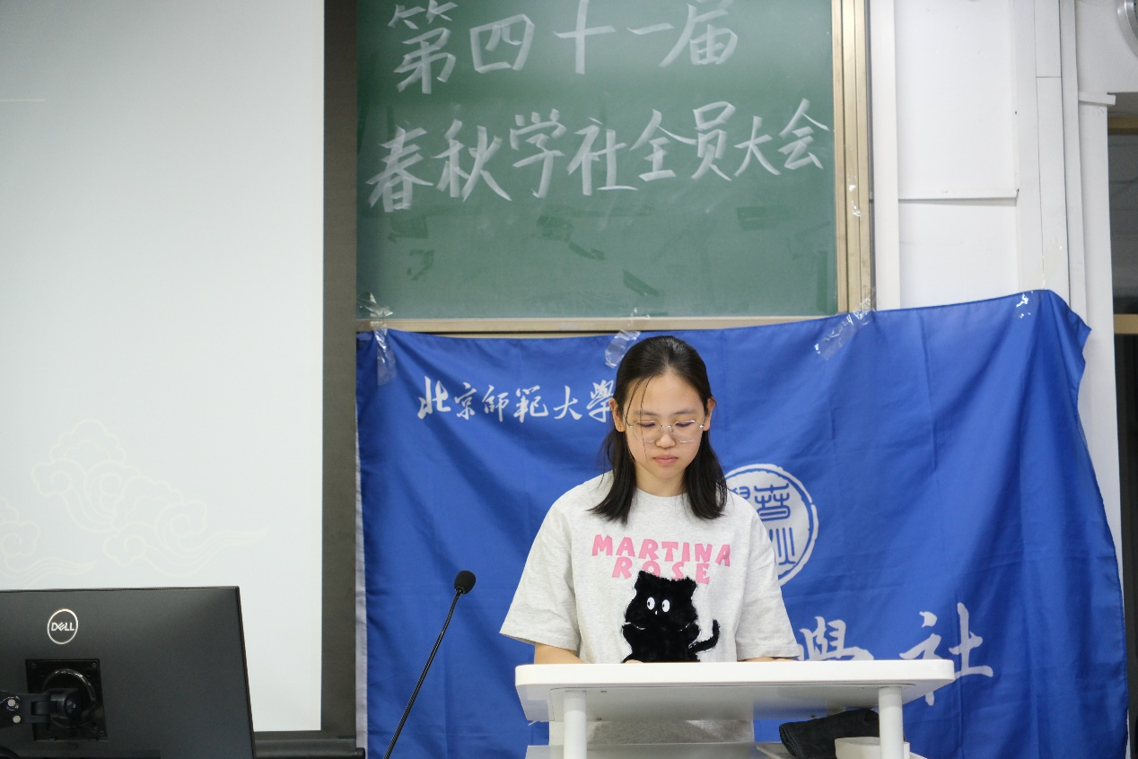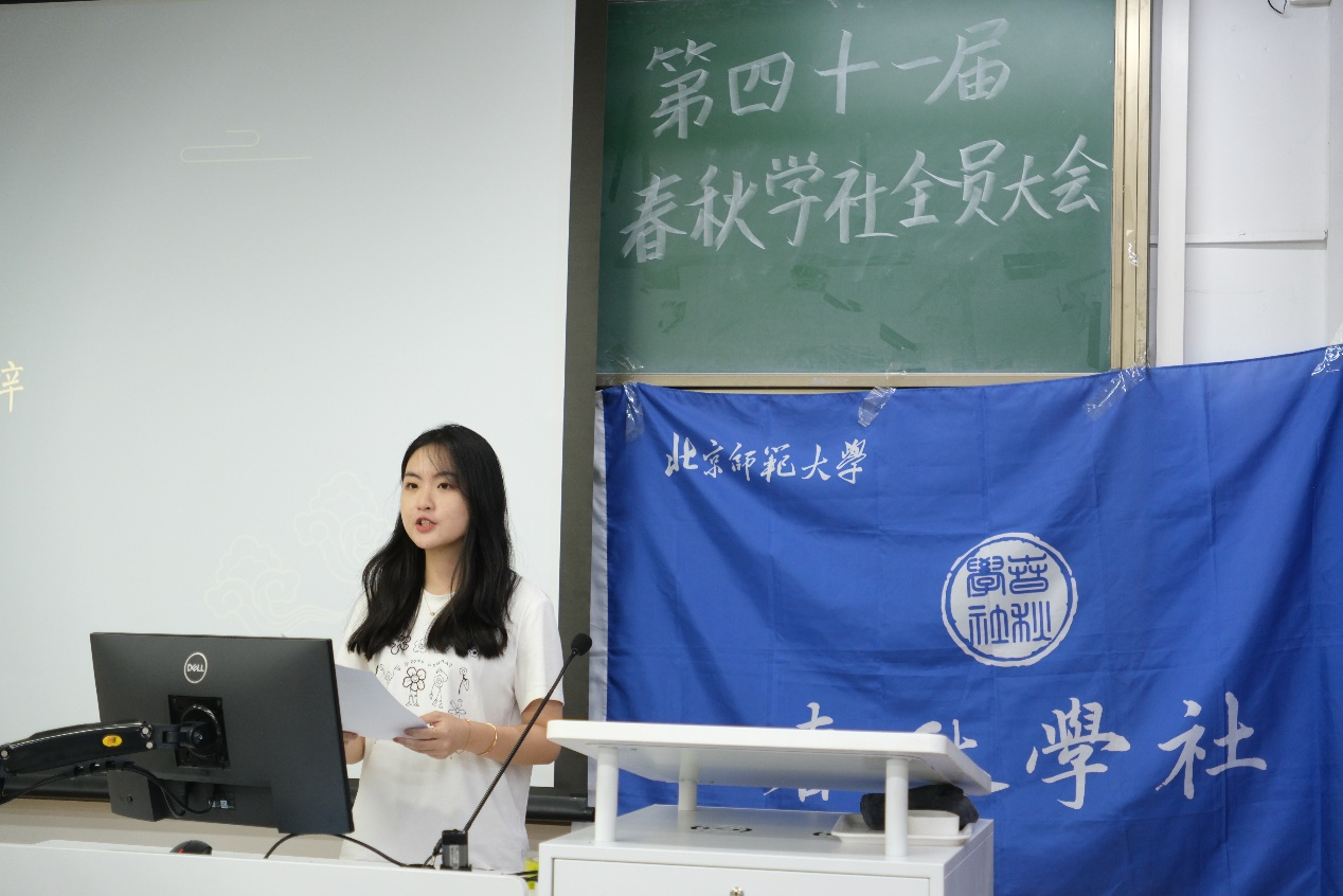 首先,副社长宋天逸介绍了本年度招新情况,第41届春秋学社共吸纳新成员56人,除历史学院外,亦有来自教育学部、工商管理学院和励耘人文科学实验班的新成员加入。随后,到场嘉宾上台为新老社员致辞。