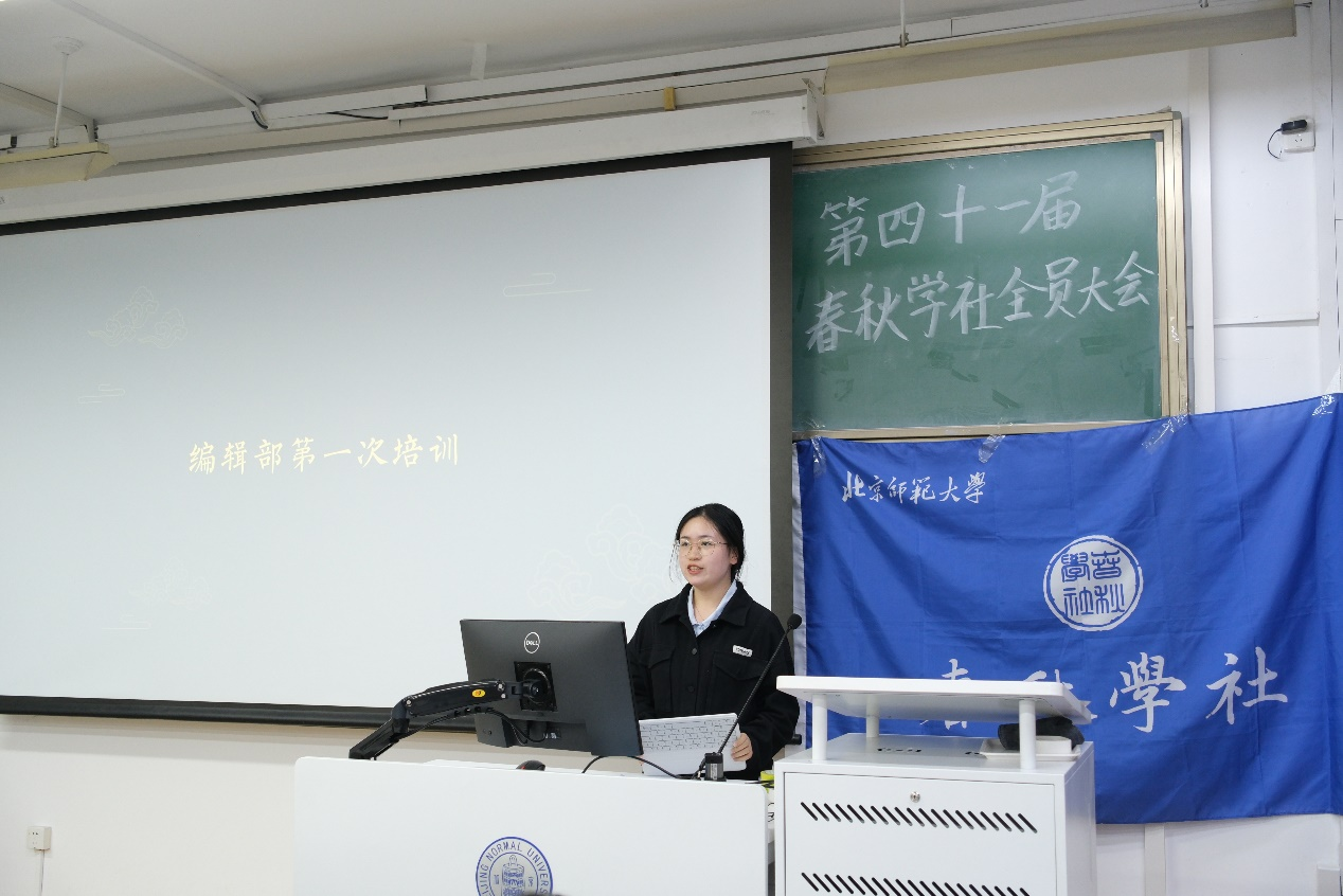 接下来,常务副社长陈扬洋主持了以“学术规范与资源检索”为主题的编辑部第一次培训。她详细介绍了历史学专业论文的写作规范,推荐了相关参考书籍,并重点讲解了论文写作过程中的注意事项和常见问题。这次培训极大地激发了新社员的学术热情,加深了他们对资源检索和学术规范的理解,为同学们未来的历史学习和研究奠定了坚实的基础。