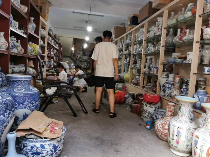 实践队在景德镇的最后一天。上午,实践队成员来到了景德镇樊家井仿古陶瓷市场。樊家井仿古陶瓷市场是全国乃至全世界最大的仿古瓷器聚集地。这里不仅有各种各样的仿古陶瓷拜见,还有各式各样的雕塑、钱币和字画,这些会流向全国的古玩市场,成为怀旧和古玩爱好者用来摆设的精神寄托。