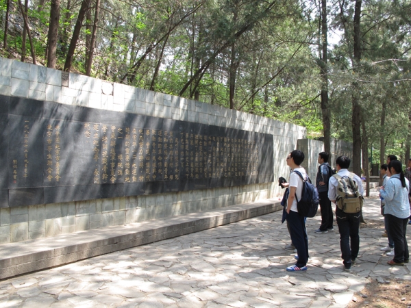 为纪念抗战胜利70周年,继承和发扬中国青年运动的光荣传统,2015年5月8日,历史学院2013级博士生党支部党员、积极分子参观了位于北京植物园樱桃沟的“一二·九”运动纪念亭。