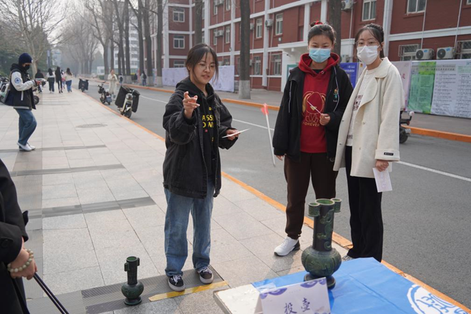 在活动中,春秋学社社员们准备了式样精美的仿古投壶和若干支“箭矢”,供同学们参与游戏。游戏规定参与者站在距离壶2米处,手持“箭矢”投入壶中。每人有三次机会,三次中投中一次即为成功,同时可以获得一枚印章,集齐规定数目的印章就能领取丰富的奖品。