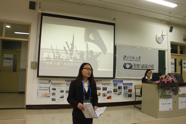 第一组代表张颖同学以“俄罗斯外交——滞钝的空心剑”为题,以俄罗斯近日对土耳其击落军机的全面反制和去年对待乌克兰问题的强硬态度为切入点,回顾了俄罗斯外交政策的发展历程,具体分析了普京政府强硬外交态度的国内外背景和形成原因,尖锐指出北约东扩等问题是影响俄罗斯外交政策的重要因素。第二组代表赵文博同学以“朝核问题——东北亚挥之不去的梦魇”为题,以2015年伊朗核问题谈判取得重大进展为切入点,在对目前有核国家核力量进行详细对比后,指出朝核问题是当今世界核安全问题的突出表现,进而具体分析了朝核问题产生的原因和现状,并提出了全面、持久解决朝核问题的几点构想。第三组代表国际关系学院朱天宇等同学以“中国与欧盟关系变迁”为题,回顾了40年来中欧关系的发展历史,并对近年来的欧债危机、难民危机和美欧“TTIP”谈判等关键问题进行了深入探讨,指出影响中欧关系的主要因素在于世界各极力量的博弈与消长。第四组代表刘畅同学以“黑旗升起的十年——‘伊斯兰国’的前世今生”为题,回顾了伊斯兰国的发展历史,控诉了其残暴罪行,具体分析了伊斯兰国发展壮大的历史和现实因素,最后指出各国政府要加强反恐合作,发挥国际组织的作用,在全球范围内反对霸权主义和强权政治,建立更为公正合理的国际政治经济新秩序。各组展示内容丰富、形式灵活,主讲语言生动、感染力强,赢得了现场观众的阵阵掌声。