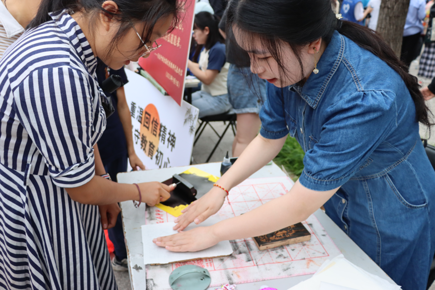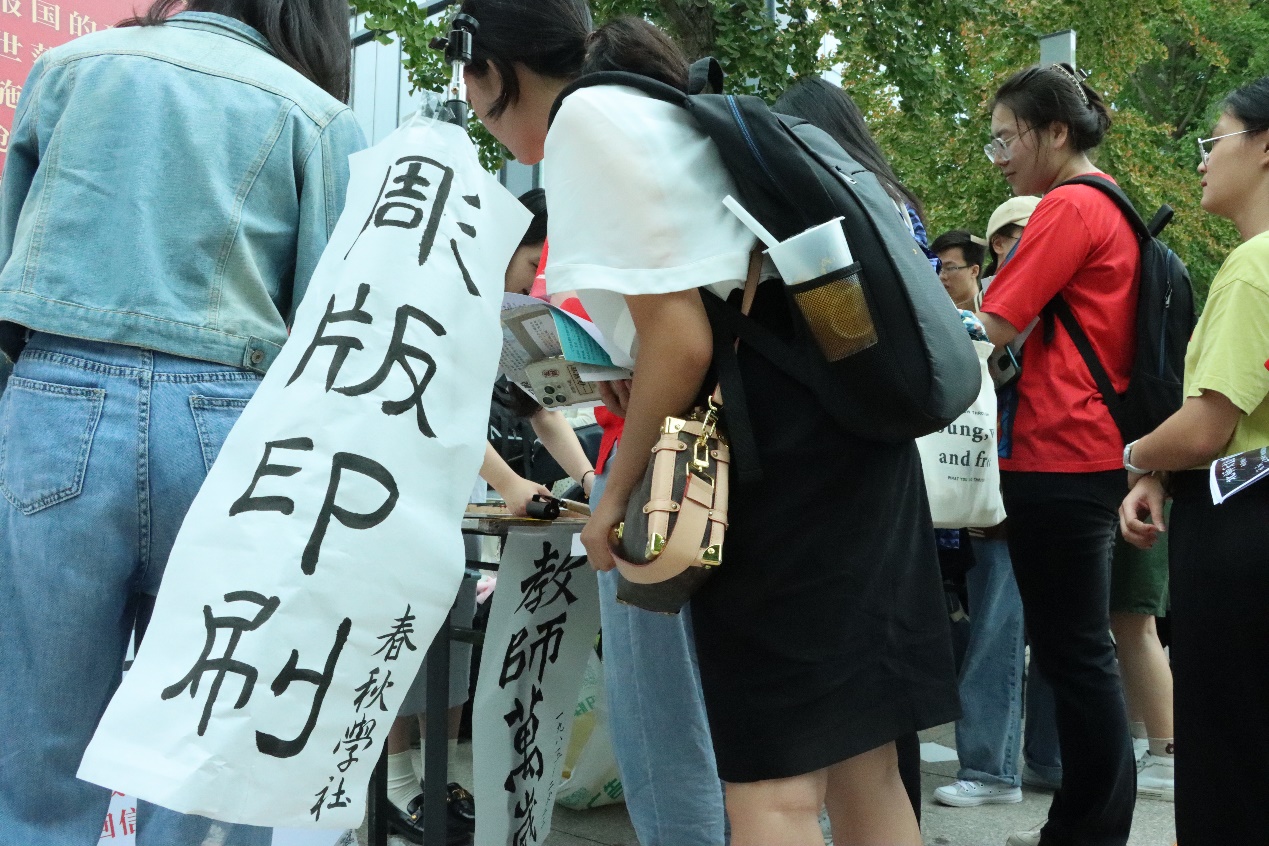 为庆祝第39个教师节,响应“躬耕教坛,强国有我”的教师节主题,9月10日上午,春秋学社参与举办了由校团委社团工作部主办的“尊师重教月”社团外场展示活动,为同学们带来了雕版印刷的独特体验。