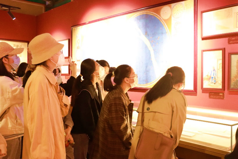 接着,同学们步入东配殿,参观“锦瑟万里 虹贯东西——17至20世纪初‘丝绸之路’历史档案文献展”。“丝绸之路”是世界文明交汇的重要通道,17至20世纪初,中国与世界各个国家地区在外交、贸易、文化、艺术等领域出现了史无前例的直接交流,共同影响了世界格局和历史进程。其中,徐光启主持测绘、汤若望参与绘制的《赤道南北两总星图》见证了中西科学交流的历史,蒋友仁绘制的《坤舆全图》呈现了17世纪时人的世界观和宇宙观,吸引了同学们驻足观看。