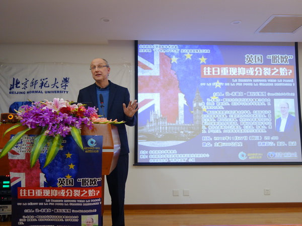 讲座开始前,我校国际交流与合作处副处长刘敏老师礼节性会见了德瓦乐教授。德瓦乐教授首先用他的母语法语表达了受邀来到北京师范大学讲学的兴奋与喜悦之情。他特别强调,这是他此行来华后首次接受来自学生团体的邀请赴高校讲学。他概括指出:英国“脱欧”的现状在整体上具有很强的不确定性:“脱欧”尚未形成定局,当下情势始料不及,未来亦充满多种可能。他继而回顾了英国与欧陆国家交往的历史进程,指出经济利益而非政治联系是英国与欧盟关系中的最主要因素。