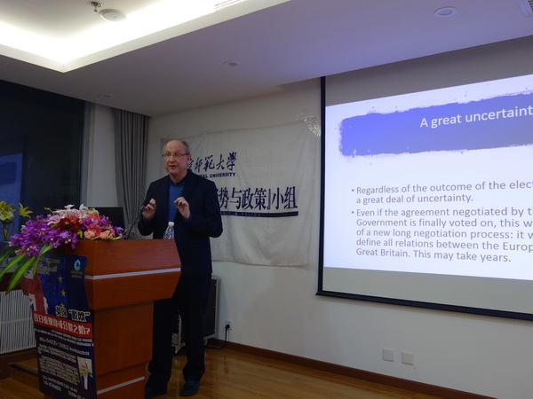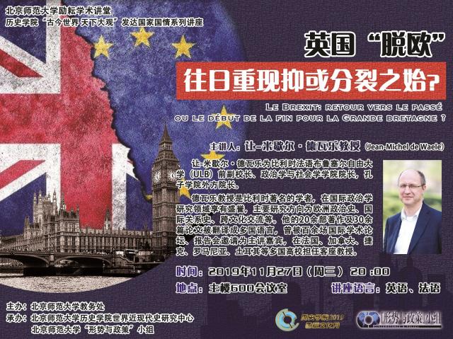 2019年11月27日晚,比利时布鲁塞尔自由大学(ULB)前副校长、政治学与社会学学院院长让-米歇尔·德瓦乐教授(Jean-Michel De Waele)应邀来到北京师范大学,在主楼600会议室作了题为“英国‘脱欧’:往日重现抑或分裂之始”的学术讲座。本讲系北京师范大学励耘学术讲堂的历史学系列讲座,也是历史学院“古今世界,天下大观——主要发达国家国情系列讲座”的第十三讲。讲座由教务部主办,历史学院世界近现代史研究中心、“形势与政策”小组共同承办。历史学院江天岳老师担任讲座主持人,世界现代史教研室主任安然教授出席了讲座。本次讲座作为历史学院2019年“国际文化月”活动的重要组成部分,不仅是“形势与政策”小组第108次集体学习,还吸引了我校多个部院系及其他首都高校学生前来聆听,学术气氛热烈。