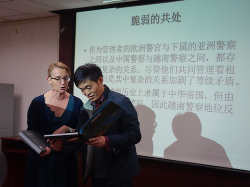 在两个小时的演讲中,柯蓉教授坚持全程使用汉语与同学们进行交流,引用了大量老照片和明信片等珍贵的图像资料,并介绍了她通过解读照片获得历史信息的治史方法,其精彩的演讲获得了参与讲座的师生的好评。讲座间隙,历史学院副院长张皓教授代表学院向柯蓉教授赠送了《京杭大运河开凿与变迁》的专著,柯蓉教授也回赠了张教授有关法国罗讷-阿尔卑斯大区人文历史地理方面的书籍。庞冠群副教授向柯蓉教授赠送了讲座海报。