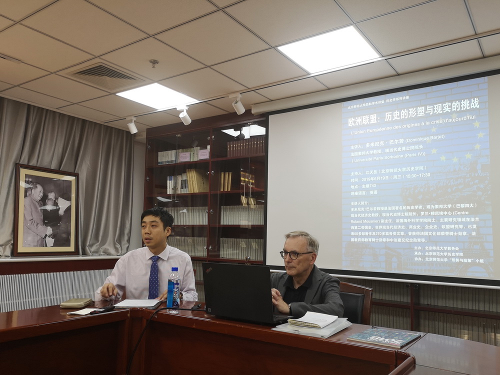 2019年6月19日下午,法国著名历史学家、索邦大学荣休教授、法国海外科学院院士巴尔若(Dominique Barjot)应邀到访我院,并以“欧洲联盟:历史的形塑与现实的挑战”为主题,在主楼743会议室为师生作了一场精彩的专题讲座。此次讲座系我校励耘学术讲堂历史学系列讲座之一,由教务部主办,历史学院承办。讲座由我院世界近代史教研室江天岳老师主持,庞冠群副教授、贾珺副教授等学者出席了讲座。本次讲座还吸引了首都高校学生与历史爱好者前来聆听。