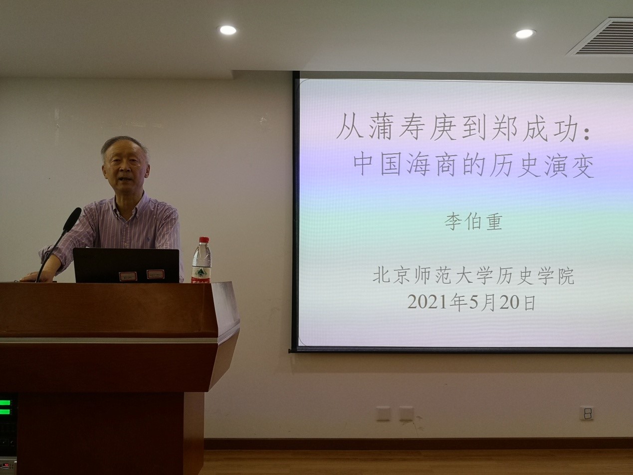 2021年5月20日上午,北京大学历史学系李伯重教授应邀到北京师范大学,作了“从蒲寿庚到郑成功:中国海商的历史演变”为主题的专题学术讲座。本次讲座介绍了海上贸易和中国海商的历史演变,讲座内容分为四个板块,其中包括古代外贸的三大转变和两个个案研究,分别是外贸重心由陆上贸易转向海上贸易,海上贸易的主要活动区域由“西洋”转向三洋交汇的“南洋”和外贸由官方贸易转向民间贸易,最后是从蒲寿庚到郑成功,两个外贸家族的个案研究。陈奉林教授主持了这次讲座。《世界知识》编辑部徐波编审、外交学院马铭老师应邀参加了本次讲座。