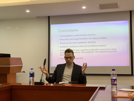 18日上午10时,库卡宁教授开展题为“何谓‘后叙事主义’?”(What is Postnarrativism?)的讲座。首先,库卡宁教授介绍道,他在北京师范大学的三场讲座(包括大会主题演讲在内)可被总结为一句话:史学知识就是获知如何在共同体规则的基础上做出正确的主张。库卡宁教授概括了以海登·怀特和安克斯密特为代表的叙事主义史学哲学的基本观点,指出叙事主义的洞见在于,将史著视为综合性的文本实体。其后果就是:第一,无法再从符合论的角度来评判史学之真;第二,史学负载了一种“强整体论”诉求,史学文本因而成为了不可拆分的整体;第三,史学文本无法被视作一种从前至后的编年史式时间序列。对此,库卡宁教授主张:应当用“受保证的断言”来代替历史学中的“真”,应当将史学视作一种介入并改变既存语境的“述行实践”,应当将历史学家当作批判性的论辩者。这是“后叙事主义”的核心观点。库卡宁教授总结称,后叙事主义更新了史学的求真观点,但这并不意味着一种极端相对主义的态度,即否认有一种标准可对史著的优劣进行评价的。相反,后叙事主义提出了一种评判史学合理性的“三方理论”:可以从认识论角度评价史学是否具有知性权威,从修辞角度评价史学的论证有效性,从话语角度评价史学是否成功介入并改变了现有语境。讲座结束之后,董立河教授对讲座的主要内容做了总结,他认为整场讲座清晰晓畅,使听众受益匪浅。