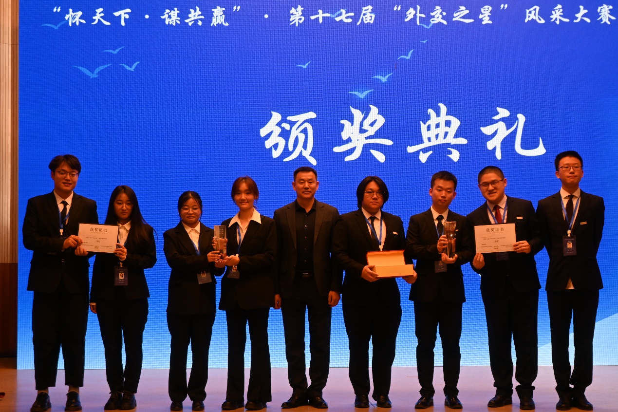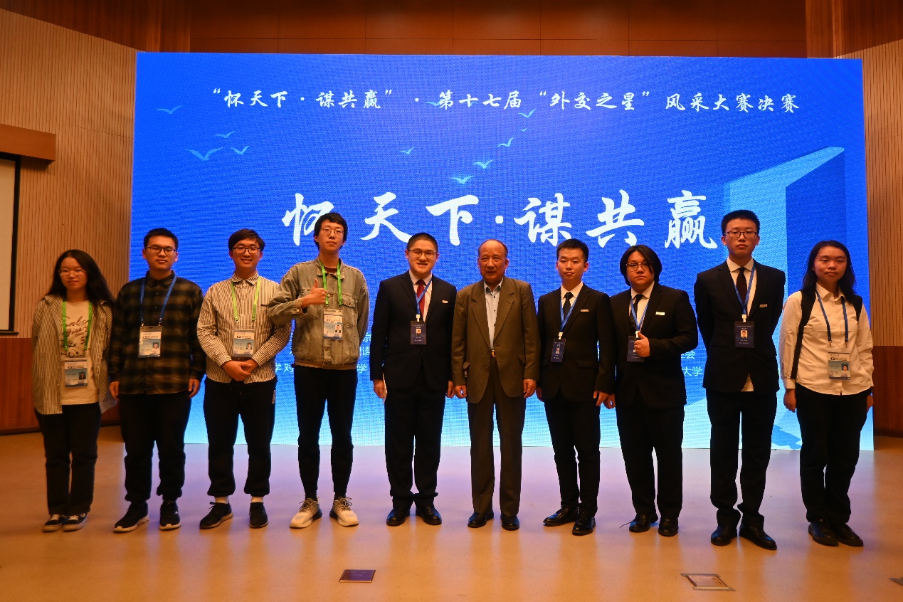 2023年5月20日晚,“怀天下·谋共赢”第十七届“外交之星”风采大赛于北京外国语大学举办。我校历史学院2020级本科生黄普凡、文学院2020级本科生吴弘亮、文学院2020级本科生张熹、文学院2022级本科生洪浩哲应邀参加比赛,荣获季军。“形势与政策”小组副组长兼学研专员张正宇、宣传专员洪子阳、外联专员牛广鹏、组长助理易珊羽等应邀前往观赛。