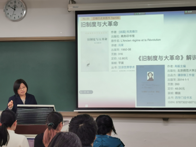 庞老师在课上为师生们讲授了法国大革命爆发前法国的社会思潮转变和阶层变动状况。课堂讲授过程有条不紊、环环相扣,从学生已知的内容延展到学界前沿的动态。庞老师深入浅出、旁征博引,在课堂上使用中文、法文、英文等多种语言,兼顾基础性与前沿性,富有启发性。