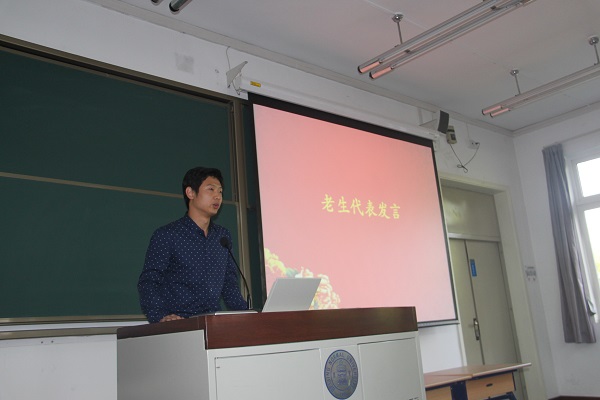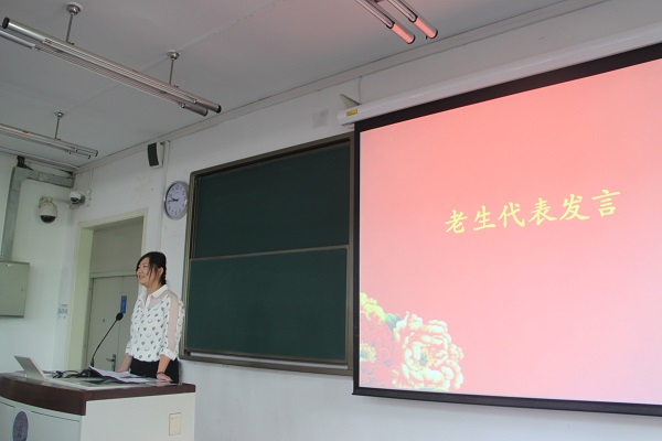 2012级本科生许文珺和2013级硕士生赵粲然作为老生代表发言。许文珺同学结合自己的经历,建议新同学要敢于尝试、严格要求自己、学会珍惜。赵粲然同学则通过陈垣先生在抗日战争期间与日本侵略者抗争的故事,使同学们认识到作为一个史学工作者应具备爱国精神和社会责任感。