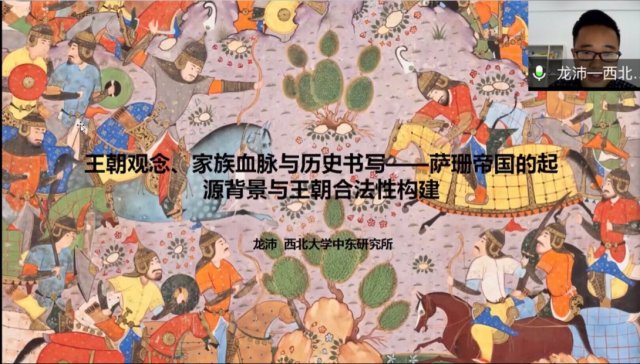 在接下来的主题报告环节中,共有6位同学做主题发言。 两位世界古代史专业的同学——北京师范大学的张弩和西北大学的龙沛先后做了题为“论阿里安对亚历山大的征服者形象的塑造”(评议人:龙沛)、“王朝观念、家族血脉与历史书写——萨珊帝国的崛起与王朝合法性构建”的发言(评议人:张弩)。