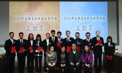 11月23日晚8时,由教育部高校辅导员培训和研修基地(北京师范大学)和开云线上平台(集团)官方网站主办,“形势与政策”小组承办的2014年首都高校新生时事知识友谊赛在教九502精彩上演。来自外交学院、国际关系学院、北京外国语大学和北京师范大学的四支代表队参加了比赛。经过笔试选拔,法学院赵赓、哲学与社会学学院卢冰屿和我院吴靖三位本科新生脱颖而出,代表我校参加比赛。马克思主义学院分党委书记、博士生导师张润枝教授、辅导员培训与研修基地王莹老师、心理学院分团委书记史佳鑫老师、哲学与社会学学院专职辅导员李亚琳老师、历史学院专职辅导员李力老师作为嘉宾出席了本次比赛。原中国驻希腊共和国大使、中国驻丹麦王国大使甄建国先生作为特邀嘉宾莅临现场,与各校学子共同见证精彩对决。此外,出席比赛的还有外交学院、国际关系学院、北京外国语大学等各高校时事组织主要负责人以及其他高校的部分同学。