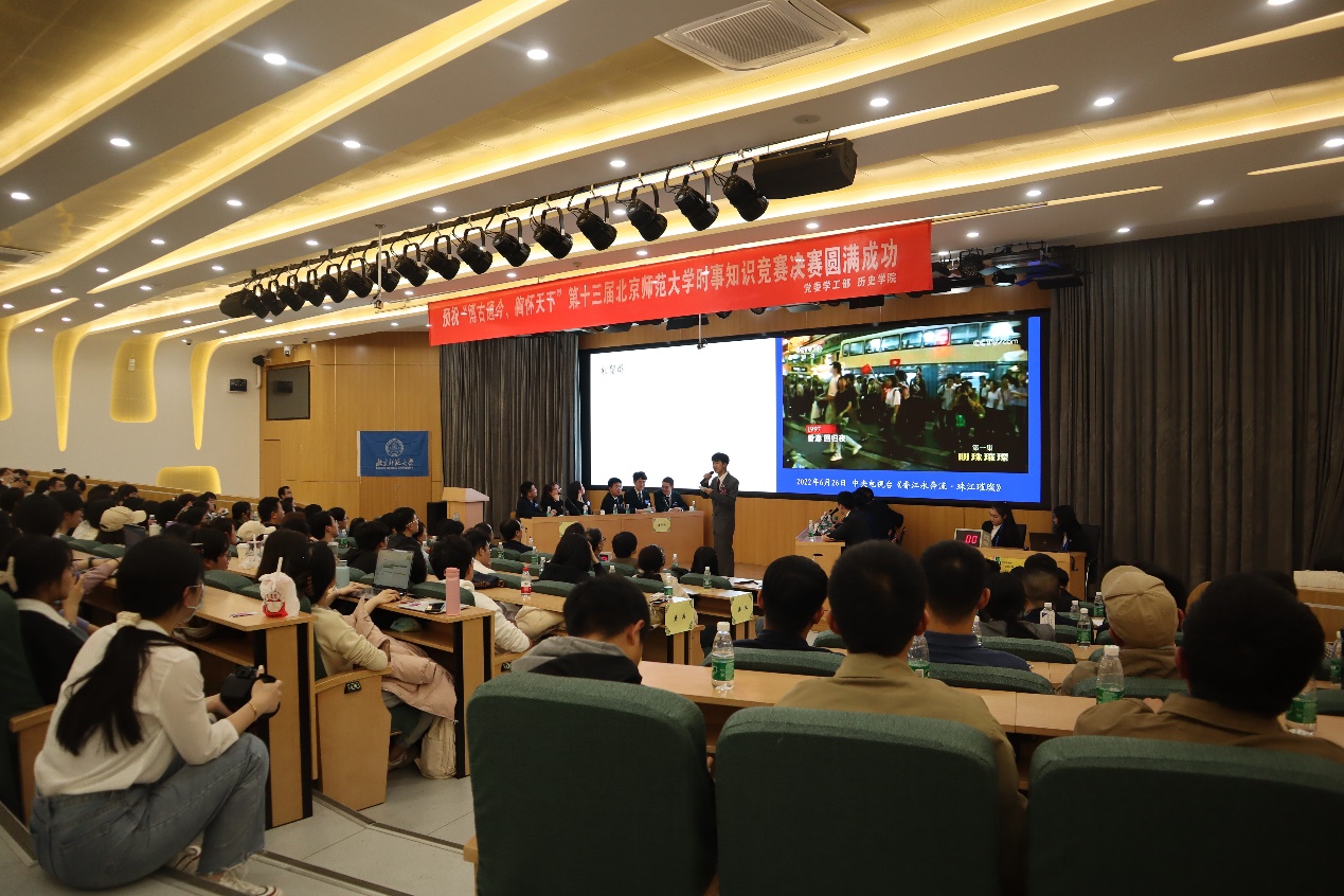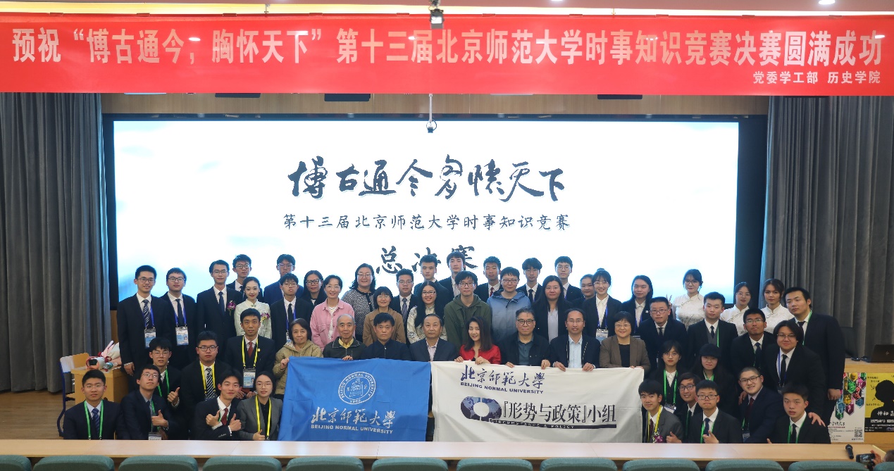 “博古通今 胸怀天下”北京师范大学时事知识竞赛自2010年起已成功举办十三届。比赛以当下时事关注为兴趣纽带,致力于探索时事研究与历史学专业学习间的融通与互动,培养学生的综合能力,成为历史专业课教学的重要延伸和历史学院人才培养的重要组成部分。比赛融知识性和趣味性为一体,凭借新颖的赛制、内涵深广的知识背景、丰富的多媒体手段,成为“形势与政策”课程的第二课堂、高校思想政治教育创新的生动实践。