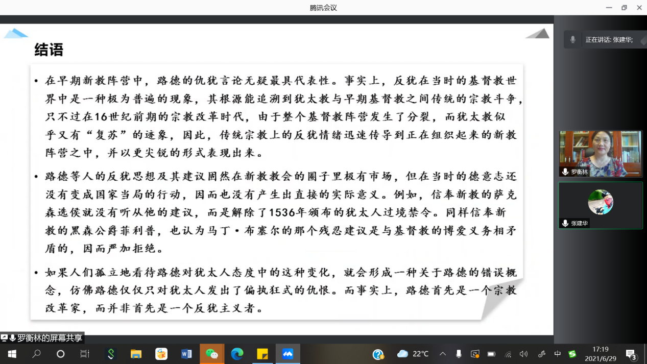2021年6月29日下午,湖南师范大学历史文化学院的罗衡林教授通过腾讯会议为我院师生及线上观众做了一场精彩的线上讲座“巨人之暗:马丁·路德对犹太人的态度及立场分析”。本场讲座系“京师史学名家前沿系列讲座”,也是开云线上平台(集团)官方网站暑期小学期系列讲座的内容。讲座由我院张建华教授主持。