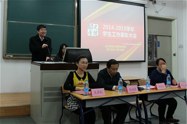 2015年12月20日,历史学院2015年学生工作表彰大会在教四201召开。本次大会旨在表彰过去一年中有突出贡献的集体和个人,并颁发国家奖学金、国家励志奖学金、京师奖学金、白寿彝史学论著奖、三好学生等多个奖项和荣誉称号,鼓励全体同学在新的一年里继续向前,不断开拓创新。