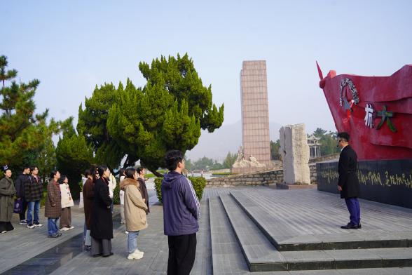 8日上午,学院师生奔赴临沂蒙阴县的孟良崮战役纪念馆。师生一行首先跟随讲解参观了孟良崮战役纪念馆主体展览,深入学习孟良崮战役中华东野战军的英勇事迹。馆陈参观结束后,师生前往英烈亭,在粟裕将军墓前举办敬献花篮仪式。蒙蒙细雨中,全体师生肃立,向粟裕将军之墓三鞠躬、敬献花篮并整理绶带。在党旗前,师生党员重温入党誓词,庄严宣誓,将对华野烈士的缅怀之情融进铿锵有力的誓言中。随后,师生登至孟良崮主峰实地参观孟良崮战役遗址,在大崮顶“孟良崮战役纪念碑”前,学院师生实地感悟到了毛主席所说“兵民是胜利之本”,深切领会到“党群同心、军民情深、水乳交融、生死与共”的沂蒙精神。