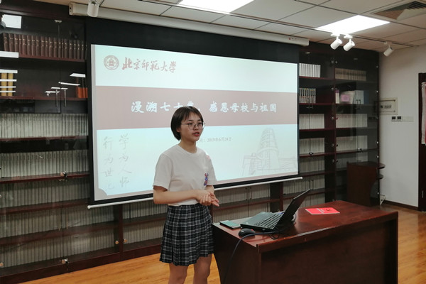 以新中国成立70周年为契机,彭紫荆党支书以“漫溯70年,感恩母校与祖国”为主题,在毕业之际,回顾70年来在时代洪流下屹立成长的母校北京师范大学,向祖国与母校表达我们毕业生的感恩之心、感激之情。党支书从最早的源头京师大学师范馆开始追溯,以1847-1956年、1957-1976年、1977-1980年、1981-至今四个阶段,结合我国不同时期的时代背景,大致梳理了我校百年的发展历程。通过结合国史与校史、历史与当下,彭紫荆同志认为在每个阶段,学校的发展或者挫折,都能够体现时代的痕迹,我们作为北师大的一员,始终带有北师大的烙印,希望大家在以后,珍惜北师大带给我们的光环,不忘初心,牢记使命。