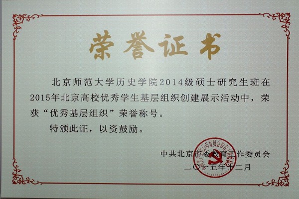 近日,在2015年北京高校优秀学生基层组织创建展示活动中,我院2014级硕士班凭借出色表现,荣获“北京市优秀基层组织”荣誉称号。该评选活动由中共北京市委教育工作委员会组织发起,我校共有3个本科生班级和2个研究生班级入选。