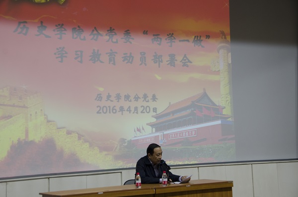 会上,耿向东书记代表历史学院分党委向学院全体党员做了关于开展“两学一做”专题教育活动的动员报告。他指出,“两学一做”学习教育是十八大以来中央全面从严治党的必然要求,是中央落实党章管理的具体要求,也是面向全体党员深化党内教育的一个重要实践,是从集中性教育向经常性教育延伸的一个重要举措。按照中央和学校对“两学一做”专题教育活动的总体要求,结合学院自身实际情况,学院分党委制定了“两学一做”学习教育总体方案,主要内容有:各学生党支部和教工党支部以共建的形式开展学习讨论;进一步完善二级党校培训;以纪念建党95周年和红军长征胜利80周年为契机,开展爱国主义教育和社会主义核心价值观教育;落实支部专题组织生活会等各项常规党建工作。希望各支部组织好学习教育活动,党员能够以积极饱满的政治态度全程认真参与。
