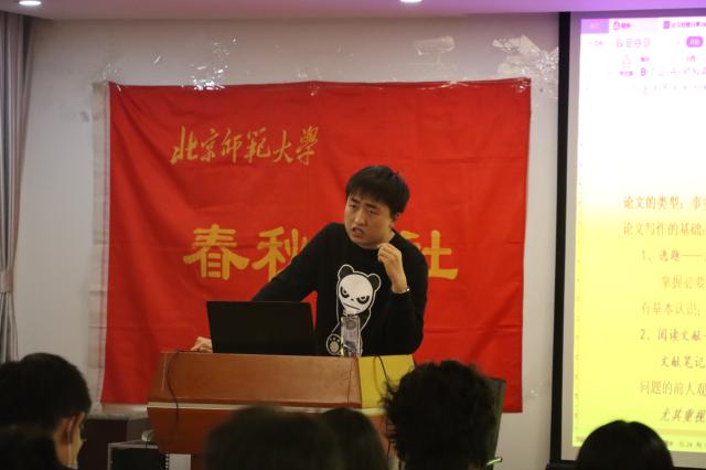 接下来是陈潇然同学的分享。他首先结合自己的论文选题经历,分享了如何以“史料+专著”的方式提出有价值的问题。随后,他就如何撰写文献综述提出了建议,并提醒同学们不要一味罗列研究成果,而应围绕文章的问题意识写作,注意用词,重视学术诚信。同时,他结合论文写作时的常见问题,明确了摘要、引言和结语的写作要点。最后,他从自身研究领域出发,向同学们介绍了史料的分类与查阅方式,并推荐了常用的电子资源检索平台和网站,以便同学们快速高效地搜集史料。