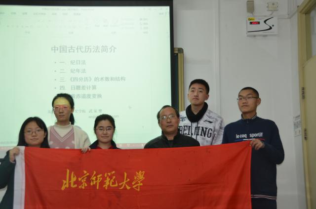 随后,武老师向同学们介绍了《四分历》年长、月长、平气、闰周四大术数的基本算法,并教授了利用四大术数推排《四分历》的气、朔干支和闰月等历法要素的方法,简要地介绍了《四分历》的结构。之后,武老师简明地说明了日躔差的计算。日躔差是太阳实行度与平行度的差值,通过古人对日躔差的研究,不难发现,我国在数算方面曾有过不小的成就。最后,武老师讲述了黄赤道度变换的知识。他从张衡的黄赤道度变换法讲起,到隋代刘焯、唐代僧一行的竹篾量度法,再到郭守敬发明近似于球面三角的算法,详尽地梳理出中国古代黄赤道度研究的发展历程。他还强调,王恂、郭守敬创立的弧矢割圆术,与现代球面三角学公式在本质上是一致的,这可以说是我国独特的球面三角学。