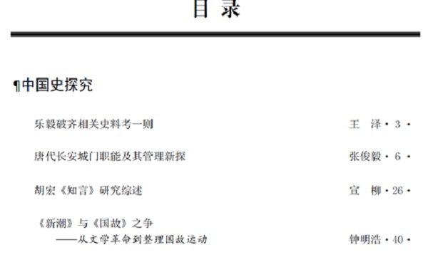 本期《学刊》的内容以中国史相关的论文为主,兼顾世界史、历史文献学、史学史等多个领域,展现了同学们的史学素养。《乐毅破齐相关史料考一则》短小精悍,纠正了学者对据辛入燕时间的误读;《唐代长安城门职能及其管理新探》一文详尽搜集史料,从多个角度对唐代长安城门的职能进行了探讨;《胡宏〈知言〉研究综述》有条理地对胡宏《知言》的相关研究进行了分析和总结;《〈新潮〉与〈国故〉之争》以两大刊物为着眼点,阐述了民国初年学术思潮的发展;《从文化认同的变化看美国华人社会融入状况的演变及原因》对美籍华人的文化认同状况进行了全景式的梳理;《朱谋?与〈邃古记〉八卷》对该书的版本与流传情况进行了介绍;《二十世纪上半期传统史学的发展与危机》对兰克史学在发展过程中出现的问题及对其的评判进行了梳理。这些文章都体现了同学们较为扎实的史学基本功,反映了青年学生富有朝气的思维活力。本期《学刊》还对封面和排版进行了调整,新封面简洁、庄重、典雅,排版细节进一步优化,并且特地选用了利于护眼的米黄色纸张,受到了大家的一致赞许。