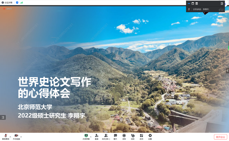 最后由李翔宇同学进行分享。他首先指出,世界史论文的写作对语言能力有着较高的要求。除了掌握通用语言英语外,还应对古典语言、国别史语言有进一步的了解和学习。多语言材料的搜集、阅读与利用对世界史的论文写作至关重要,李同学提醒同学们在这方面要多请教老师、前辈。此外,他还强调了学术史梳理的重要性。学术史写作最重要的目标就是追溯源流,而不是平行地罗列各种论著的名称。同时,他建议论文写作时要多了解不同的史学理论和研究方法,但不能迷信某一范式,应注重从问题出发进行研究。