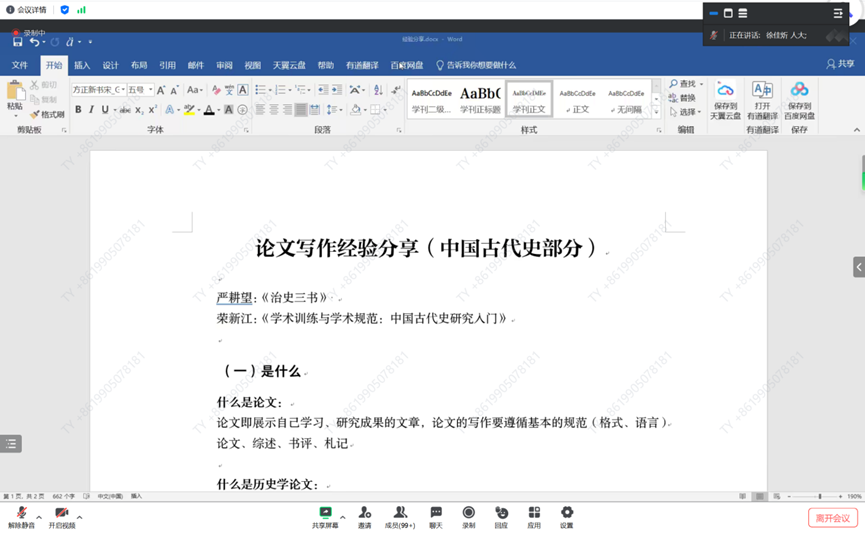 首先,徐佳炘同学展开了中国古代史方向论文写作的经验分享。撰写中国古代史论文既需要了解不同历史阶段的史料特点和重要理论,也要提升文献学、外语等基本素养。就选题、史料搜集和行文三个方面,徐同学给出了具体建议。题目的产生应当基于史料阅读和学术史整理,切口要小,做到“小题大做”;以问题为导向搜寻史料,重视一手史料;写作时注重语言的逻辑性和论证结构的严谨性,同时可以适当运用图、表等多样化的表达方式。