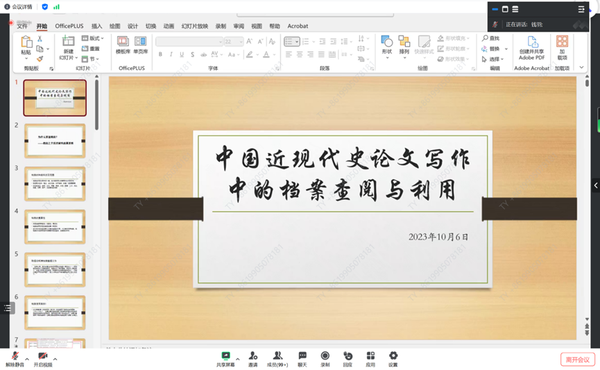 接下来,钱羽同学以档案的搜集与利用为切入点,进行了中国近现代史方向论文写作经验的分享。在档案搜集方面,他结合个人经历,介绍了利用数据库平台,寻找已出版的档案汇编或选编、档案馆实地查阅三种方式。使用档案资料时要仔细辨别档案的真实性,关注历史编纂者的主观性;同时规范使用,避免断章取义。最后,他强调在收集史料时要“竭泽而渔”,注意文献引用的规范性。