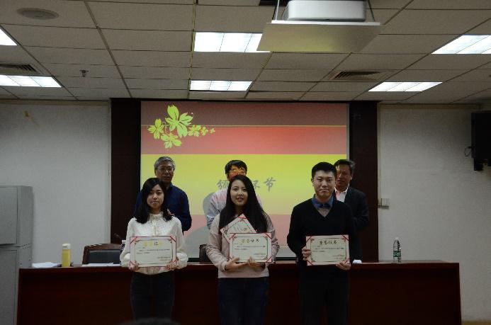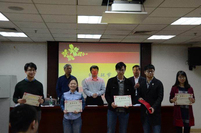 首先,由周文玖老师宣读2017年度获奖学生名单。张弘毅等4名同学获得一等奖,江林泽等13名同学获得二等奖,张向朋等9名同学获得三等奖。杨共乐、李帆和周文玖三位老师为获奖同学颁发荣誉证书并合影留念。