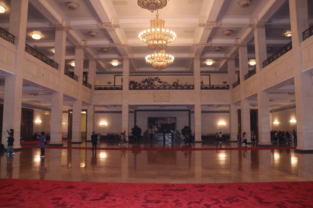 上午九时许,小组成员抵达人民大会堂东门。映入眼帘的是宽83米的三组台阶和12根顶天立地的大理石门柱。这里是国家举行欢迎仪式的重要场所。拾级而上、经由中央大厅步入二层,同学们来到人民大会堂的核心区域——万人大礼堂。这里是中国共产党全国代表大会和全国“两会”等重要会议的召开地点。穹庐圆顶气势恢宏、三层桌椅层层递升,“满天星斗,水天一色”的设计布局气象万千、动人心魄。