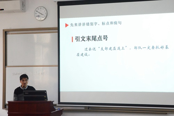在培训中,张端成同学讲解了有关错别字、标点和病句的内容,用日常新闻稿写作的事例分析了撰写稿件中的常见错误,加深了同学们对新闻稿写作技巧的理解。在新闻写作方面,张端成同学从标题、行文、图片格式等方面展开了具体的实践指导。他指出,好的新闻稿只有在细节处多加揣摩,才能传达出深入的含义。此外他强调,今天的新闻就是明天的历史,撰稿者要记述事迹,宣明时序,做好史料留存的工作。