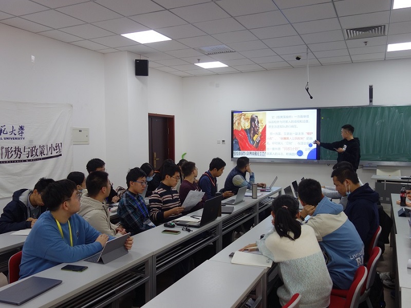 “形势与政策”小组20级组员李舒祺、黄普凡和院系联络员吴弘亮从历史、经济、政治和社会等多个角度分享了对世界热点时事的理解:李舒祺从美国BLM运动切入,强调如今美国的身份政治模糊了阶层矛盾,进而导致阶层异化问题;黄普凡将德国与欧盟相联系,详细介绍了德国国内政党格局的变化,并由此分析了其可能对欧盟造成的影响,探讨欧洲一体化进程中国家与联盟之间的利益关系与政策导向,展望德国与欧盟的未来;吴弘亮以法国教师遇害事件为线索,通过对法国移民历史和现状的回顾,以及“文化一致、共和同化”政策的分析,研究法国移民问题和应对政策如何影响到法国社会的割裂化趋势。每位主讲人介绍完毕后,同学们积极提问、交流,互相补充、启发。