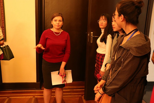 观影结束后,大使夫人与娜塔丽娅女士热情地带领大家参观使馆的馆舍和花园,详细介绍了波兰使馆的基本情况。在庄重典雅的哥白尼厅中,娜塔丽娅女士特别指出:今年是波兰重获独立100周年,希望同学们以此为契机,增进对波兰历史的了解。临别之际,我院学生代表向大使夫人赠送了师大纪念品并合影留念。