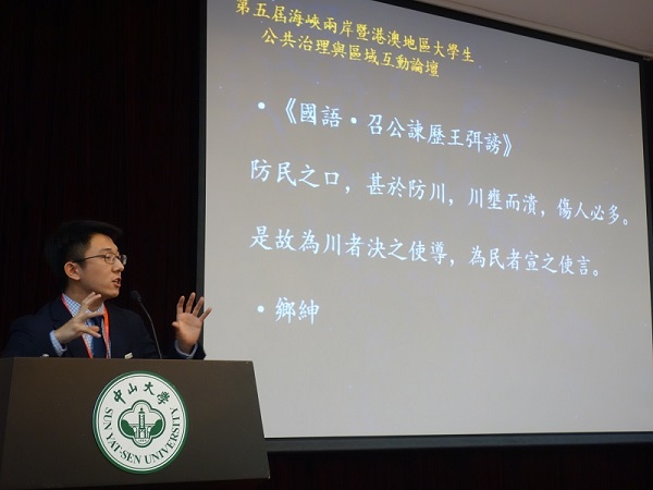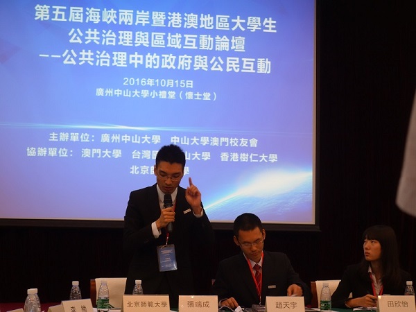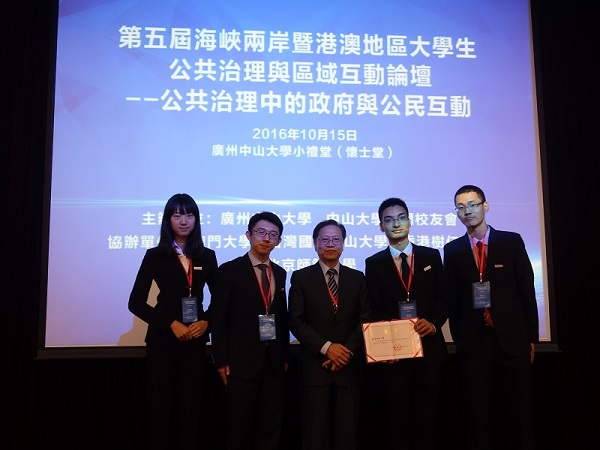 2016年10月15日,第五届海峡两岸暨港澳地区大学生公共治理与区域互动论坛在广州中山大学举行。由我院2014级本科生王聿闻,2015级本科生田欣怡、张端成,经济与工商管理学院2015级本科生赵天宇四位同学组成的北京师范大学代表队受邀参赛,在论坛中表现出色,获得团体亚军。我院“形势与政策”小组承担了本次论坛的校内选拔和培训工作。