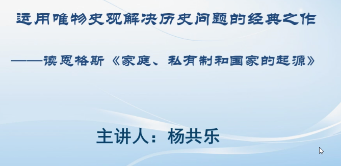 《家庭、私有制和国家的起源》是关于古代社会发展规律和国家起源的著作,是马克思主义国家学说代表作之一。杨共乐教授从背景、内容、方法和影响四个方面对这一经典著作进行了解读。杨老师回溯了唯物史观的产生过程后指出,恩格斯1884年写下《家庭、私有制和国家的起源》,继承了马克思的事业,进一步丰富了“历史科学”的内容,是对马克思的最好纪念。社会和社会的发展,是恩格斯研究的重心。杨老师对恩格斯的研究方法进行了总结:对提修斯改革的论述体现出了唯物主义的方法论;第四版序言体现了考镜源流、学术溯源的方法论;从雅典、罗马和德意志国家产生的历史过程入手,得出国家起源的三种途径,则体现了典型案例、归纳概括、由多而一的方法论。列宁的《国家与革命》是对恩格斯国家学说的继承和发展,对于俄国十月革命和中国革命的胜利影响巨大。