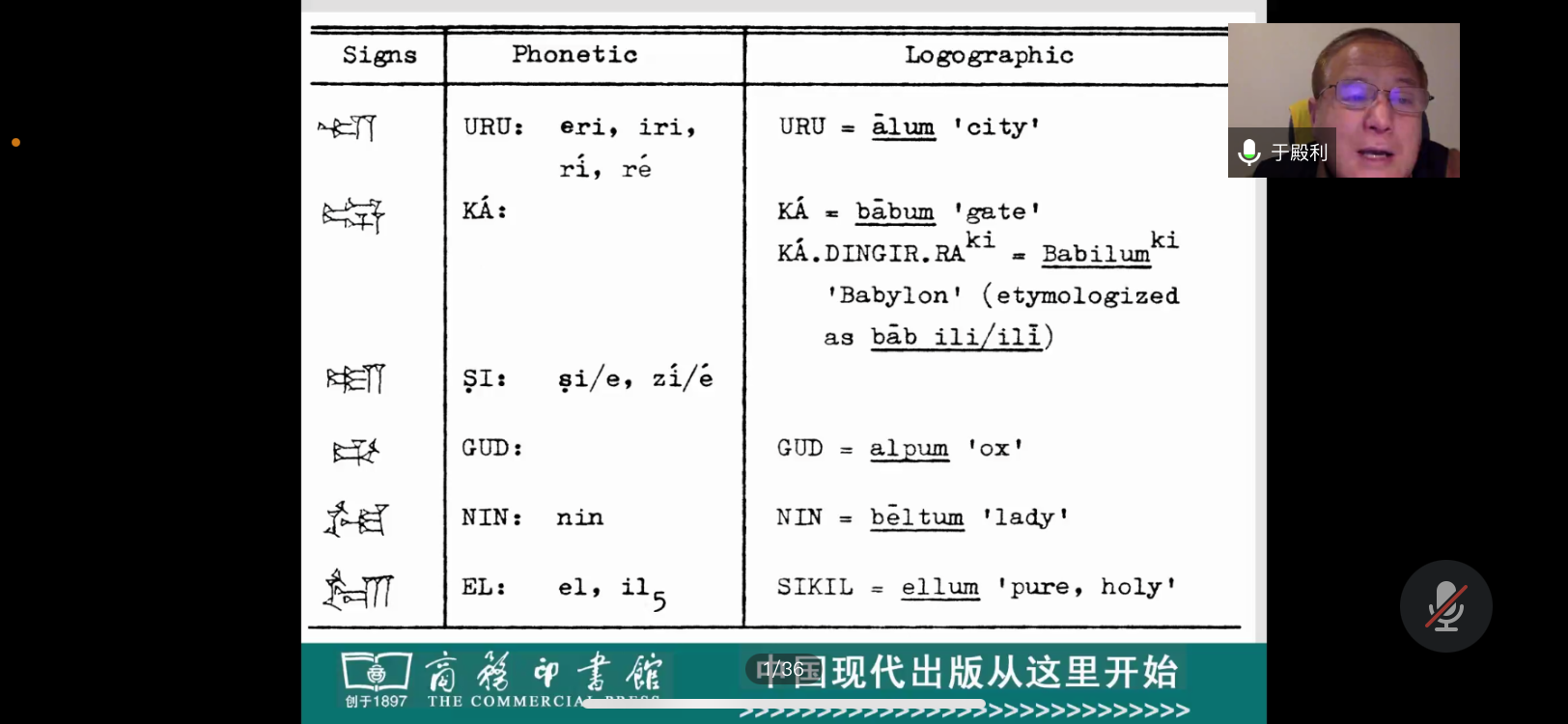 于殿利教授接着讲述了楔形文字的起源与演变历程。他梳理了楔形文字的出现与苏美尔文明的诞生关系,指出苏美尔文经历了从图画到象形、再到楔形的转变。两河流域独特的书写材料和书写工具使得苏美尔文在逐渐简化的过程中呈现楔形。苏美尔文继而传到了阿卡德地区,随后传给巴比伦人和亚述人等众多民族。这些民族的书写符号都具有楔子的形状,被统称为“楔形文字”。