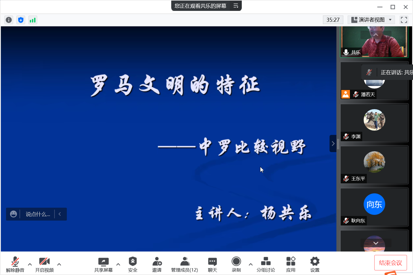 党委委员杨共乐做了题为“罗马文明的特征——中、罗比较视野”的辅导报告。杨共乐对比中国和罗马文明之间的不同特征,系统梳理了罗马法对推动罗马社会发展的重要作用,同时指出中国的圣贤建立了以修身和自强为重点的“自律”文化,是中华文明持续发展的文化生命线。