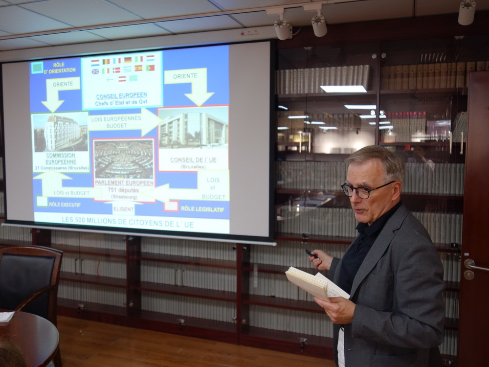 2019年6月19日下午,法国著名历史学家、索邦大学荣休教授、法国海外科学院院士巴尔若(Dominique Barjot)应邀到访我院,并以“欧洲联盟:历史的形塑与现实的挑战”为主题,在主楼743会议室为师生作了一场精彩的专题讲座。此次讲座系我校励耘学术讲堂历史学系列讲座之一,由教务部主办,历史学院承办。讲座由我院世界近代史教研室江天岳老师主持,庞冠群副教授、贾珺副教授等学者出席了讲座。本次讲座还吸引了首都高校学生与历史爱好者前来聆听。