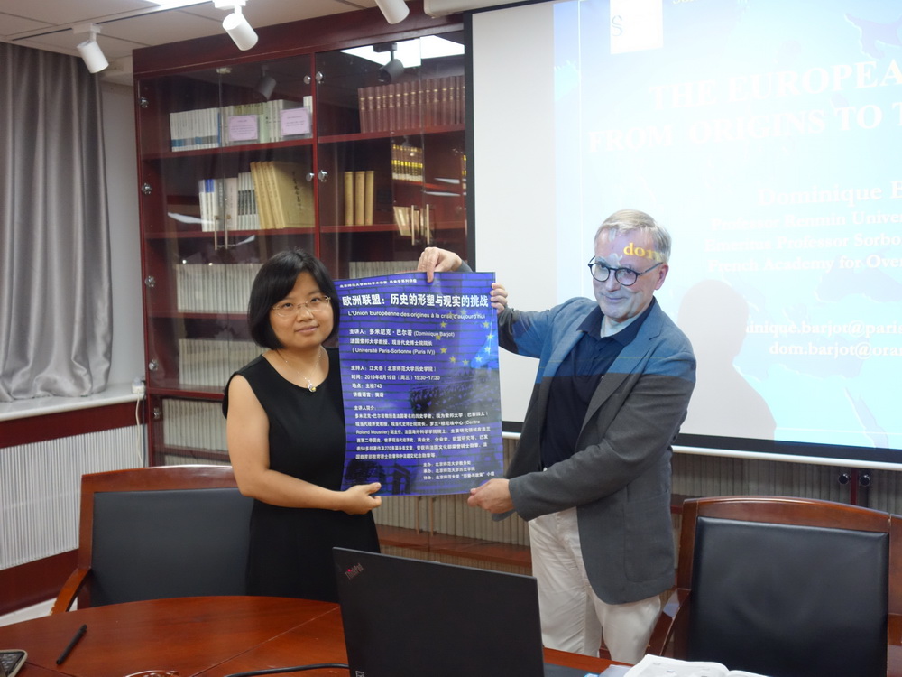 在近两个小时的演讲中,巴尔若教授全程使用英语和法语与师生交流,通过分析近现代欧洲政治与经济主要问题,结合大量历史照片、地图、统计图表,全景式地回顾了欧洲一体化的历史,分享了他对于欧盟与欧洲未来的看法,获得了在座师生的一致好评。在随后的提问环节中,巴尔若教授和现场师生就英国“脱欧”的历史与现实、欧洲央行的作用、欧洲国家海外属地与欧盟的关系等问题进行了交流,教授深厚的学养、强烈的现实关怀给同学们以深刻启迪。历史学院世界近代史教研室主任庞冠群老师指出:巴尔若教授对欧洲一体化进程的分析充满洞见,不仅让我们对欧洲历史与现实有了更为深入的了解,也在欧洲历史教学与研究方法上给我们带来许多启发。讲座结束之际,庞冠群老师向巴尔若教授赠送了本次讲座的海报作为纪念。