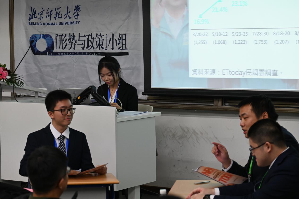 第三组代表、2022级哲学学院本科生杨佑等同学以模拟《海峡两岸》节目的形式展示主题《“蓝柯一梦”——“蓝白合”破局探析》。同学们分别饰演《海峡两岸》“代班主持人”、“邢予正时事评论员”等角色,围绕2024台湾地区领导人选举进行讲解分析。他们创造性地借用电视节目形式,首先介绍了台湾地区以国民党、民进党和民众党为代表的“蓝”“绿”“白”三股政治力量,又从岛内蓝白双方互补性和合作的潜在空间等角度重点介绍了“二对二幕僚磋商会”“马办会”“君悦会”等重要节点事件。历史学院世界近代史教研室贾珺副教授充分肯定了本组的选题的立意价值与生动形式,辩证分析了蓝白合作破裂的局面,引导大家通过对台湾地区时事的深入观察,达到筑牢知识基础、加强独立思考的自我培养目标。