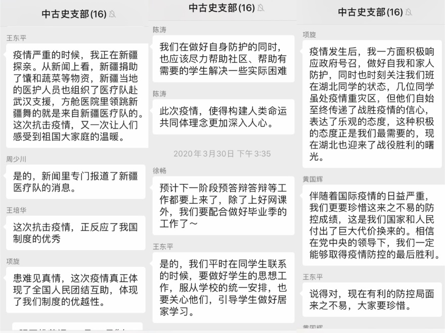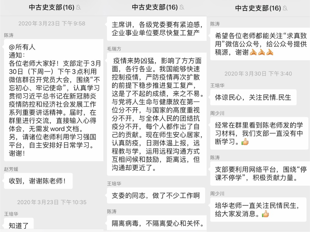 2020年3月30日下午,中国古代史党支部利用支部微信工作群召开党员大会,围绕“不忘初心、牢记使命”,认真学习贯彻习近平总书记关于统筹推进新冠肺炎疫情防控和经济社会发展工作系列重要讲话精神。会议由支部书记陈涛主持。