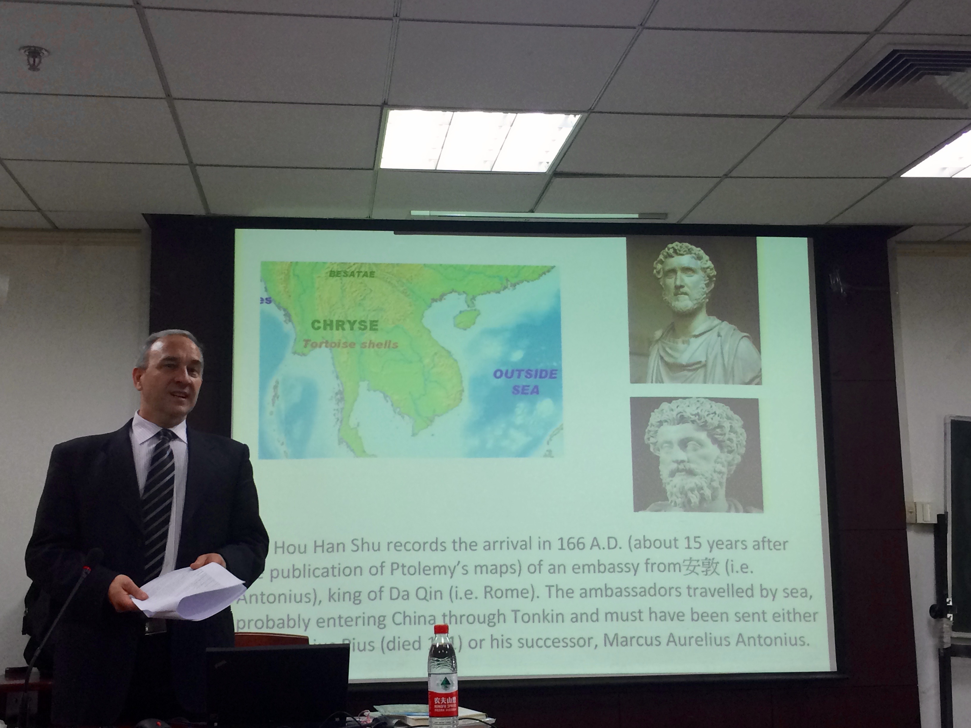 2015年4月28日上午9:30--11:30,北京外国语大学麦克雷(Ferrero Michele)教授在主楼600室做了题为《拉丁语与汉学传播》的学术报告。麦克雷教授1994年毕业于意大利都灵大学,获拉丁语和古希腊语博士学位,现为北京外国语大学欧洲语言文化学院外籍专家,拉丁语言文化研究中心主任,主要研究领域为拉丁语和西方古典文化。此次讲座由历史学院倪滕达老师主持。来自历史学院及北京外国语大学等其他高校的部分学生到场聆听。