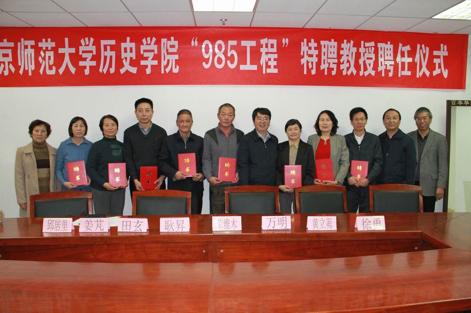 2014年11月21日,历史学院在主楼609会议室举行了“985工程”特聘教授聘任仪式和座谈会,历史学院院长杨共乐教授、分党委书记耿向东研究员、副院长李帆教授出席了会议。此次受聘并应邀前来参加座谈会的“985工程”特聘教授有耿?教授、万明教授、姜?教授、黄立?教授、徐勇教授、荣维木教授、田玄教授、邱居里教授。